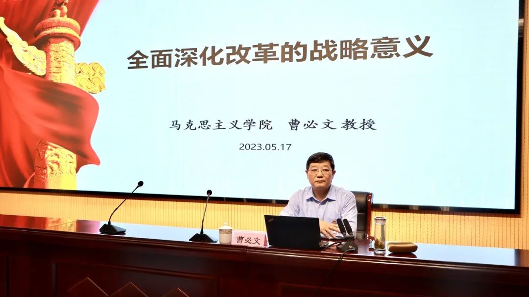 本次主题报告会主要围绕“为什么要深化全面改革”和“如何推进全面深化改革”两个问题展开。首先,曹教授从理论维度、历史维度、世界维度和现实维度阐述了改革是人类社会发展进步的必由之路这一结论;结合邓小平和习近平的主题讲话说明了改革开放是决定当代中国命运前途的关键一招;结合我国目前遇到的发展瓶颈说明了我国的改革进入攻坚期和深水区。其次,针对“如何推进全面深化改革”这一问题,曹教授介绍了八个要点:坚持改革的全面性、发扬不畏艰险的勇敢性、把牢总目标的坚定性、坚持党的领导的政治性、坚持改革方向的正确性、坚持改革的人民性、坚持改革的总体性和坚持积极主动的开放性。